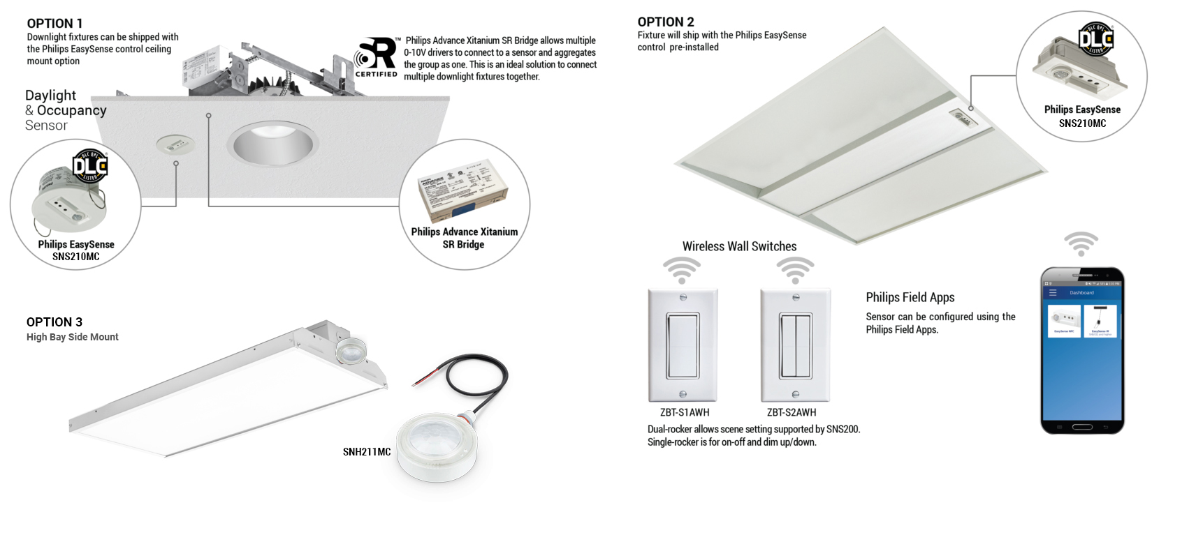 | • Occupancy sensing, daylight harvesting and task tuning in one device • Scene setting and occupancy sharing • Compact size, 2-wire connection • Operates with Philips Advance Xitanium SR LED drivers and qualified wireless switches • Configuration of sensor parameters– if desired – using NFC or IR via intuitive Android-based Philips field apps • DLC qualified: Listed on the QPL for Networked Lighting Controls |